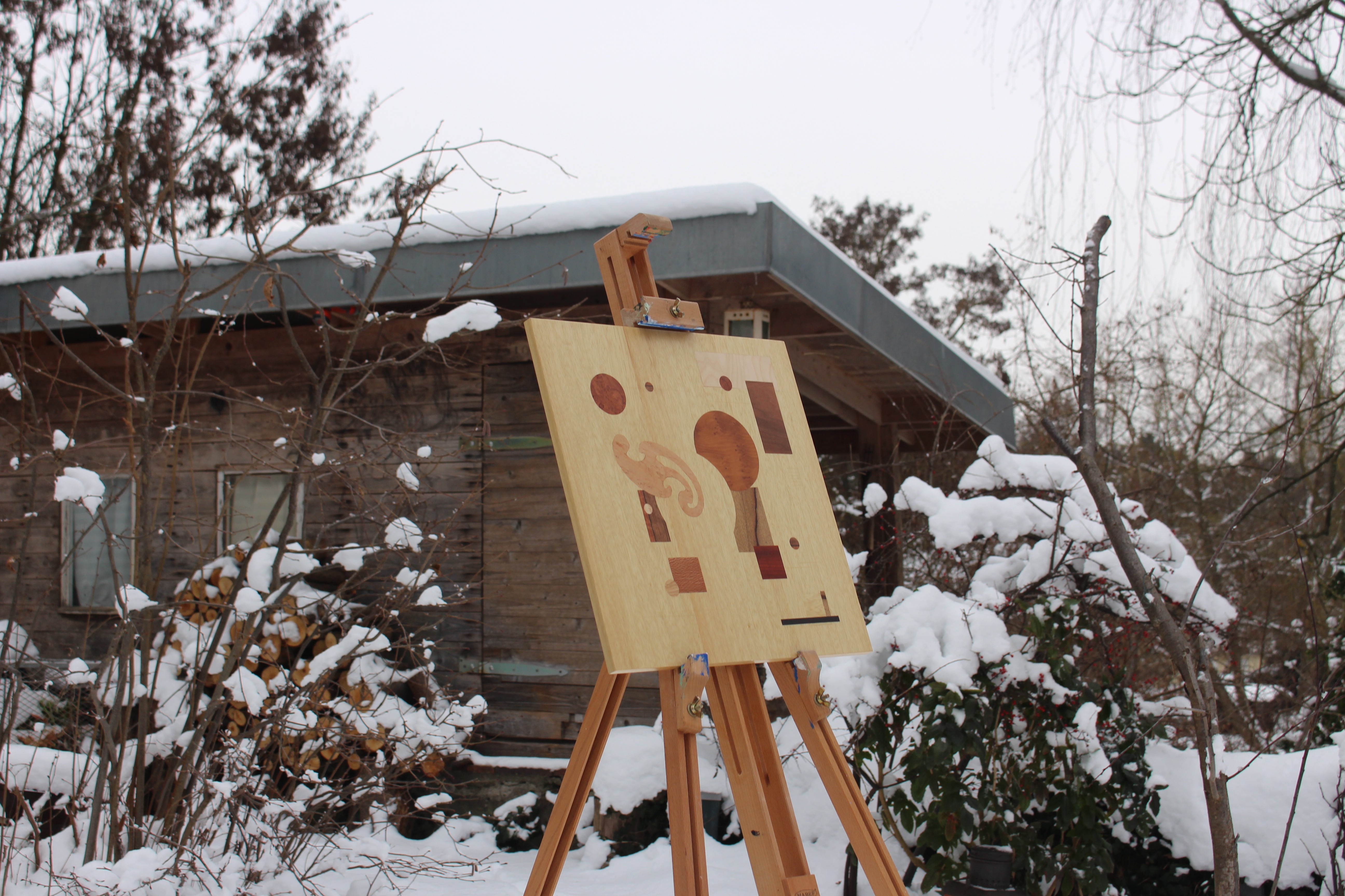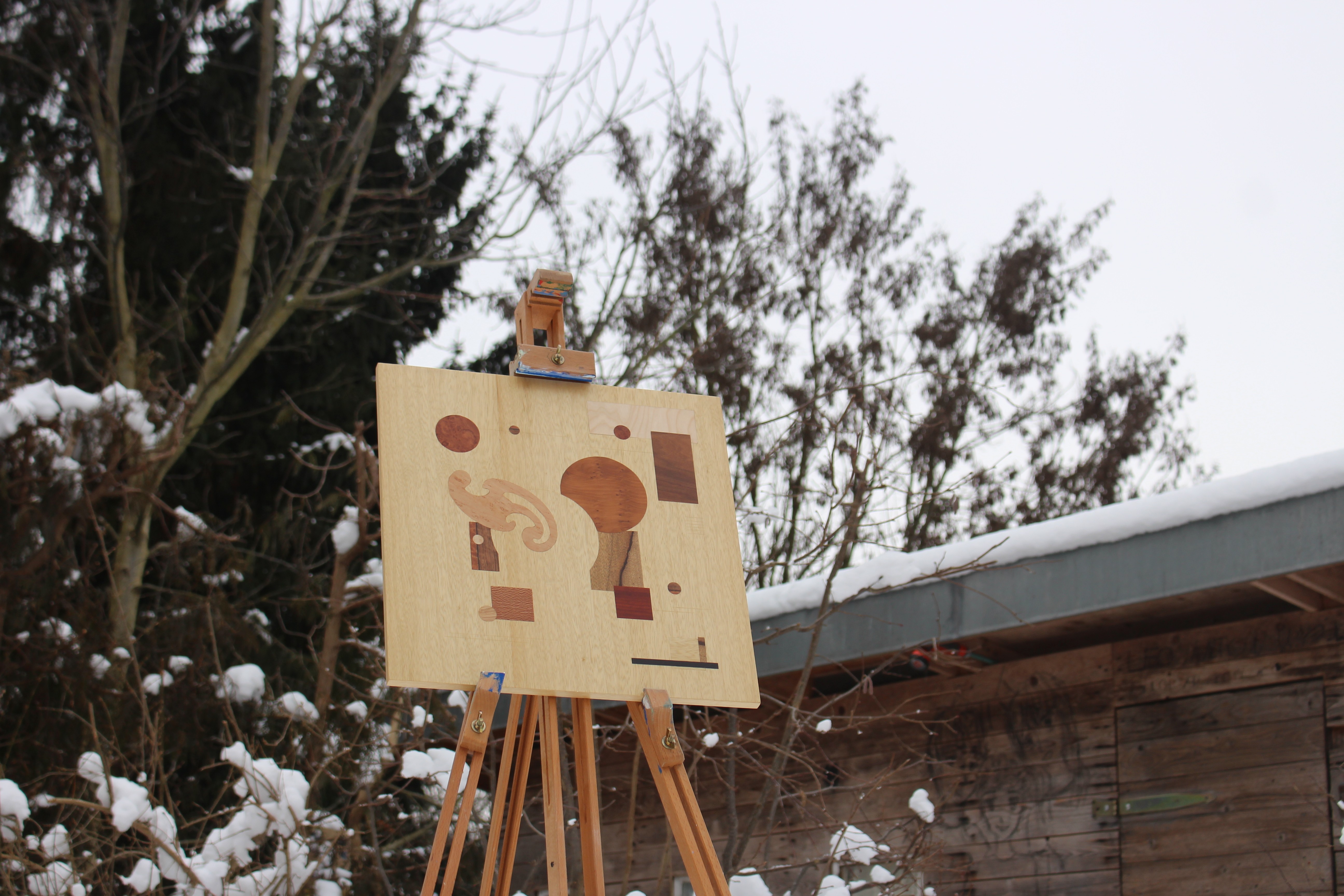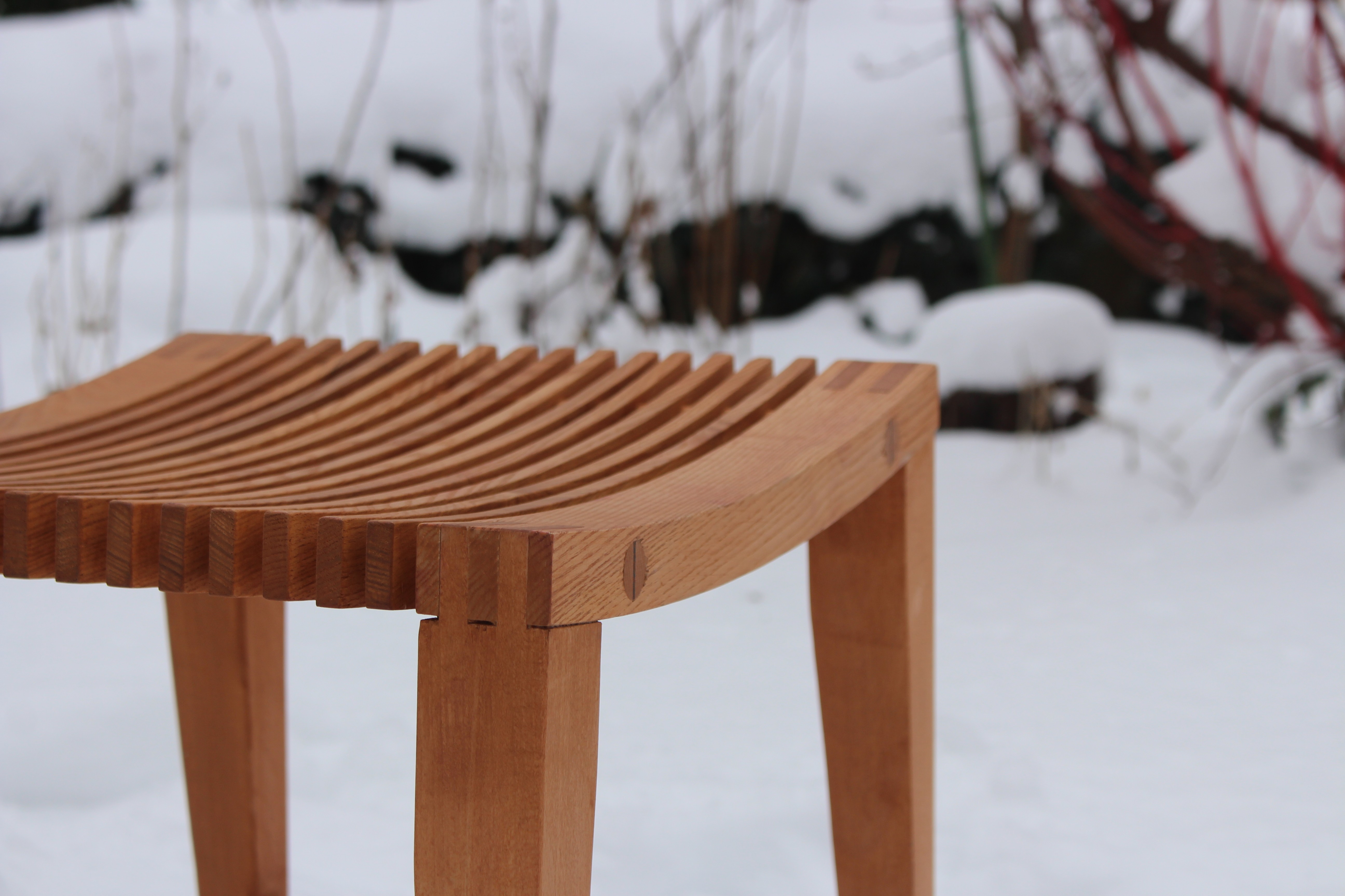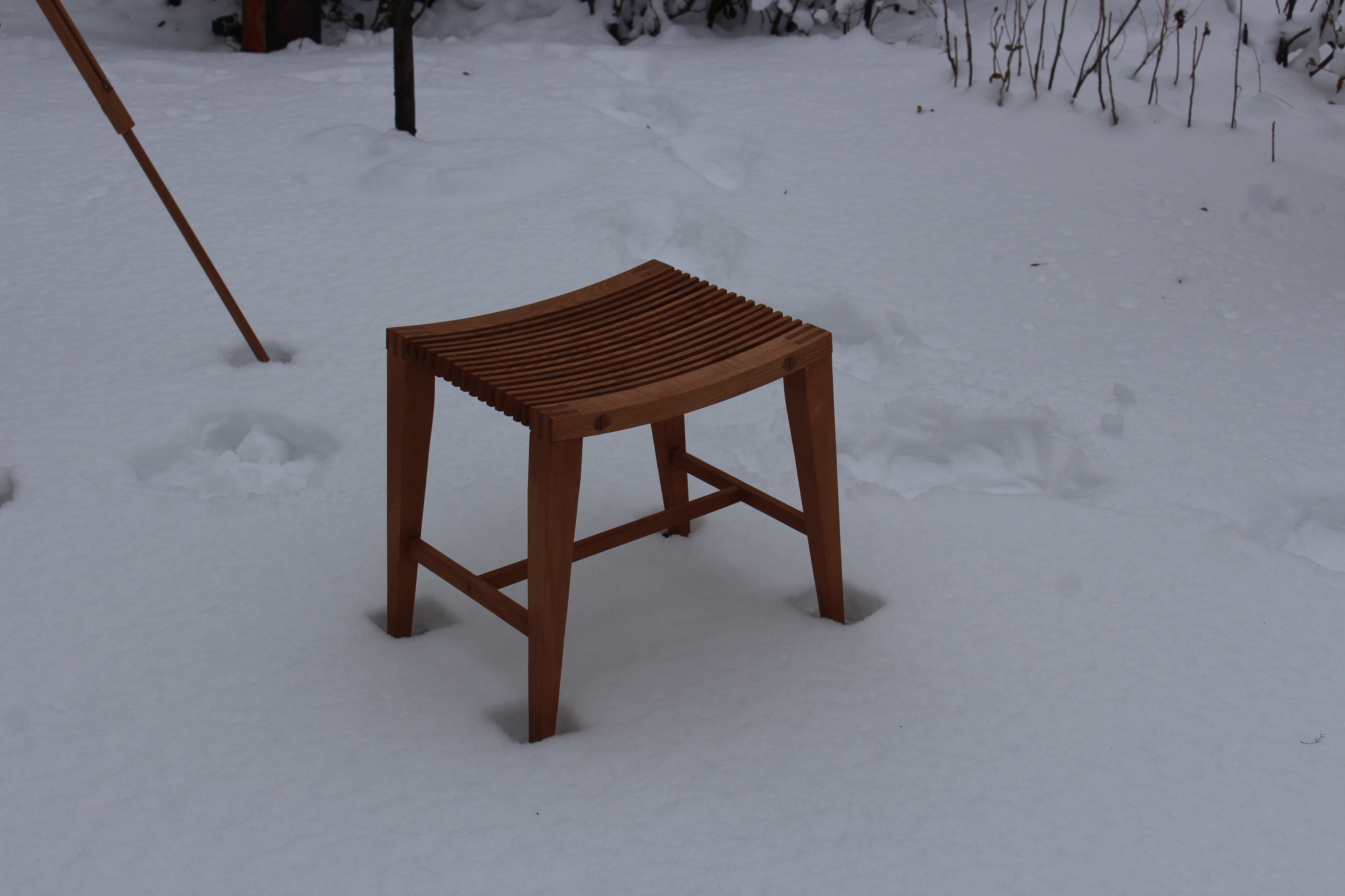 Created during my training, Ulrike began as a shared workshop project in surface and machine courses, where we could take our pieces home to complete and refine them. The stool follows a given design and was built collectively from ash and beech, focusing on clean joinery and accurate shaping. The inlay is my own addition—an abstract composition made from a mix of different veneers, bringing a personal layer of color, rhythm, and detail to the classic form.