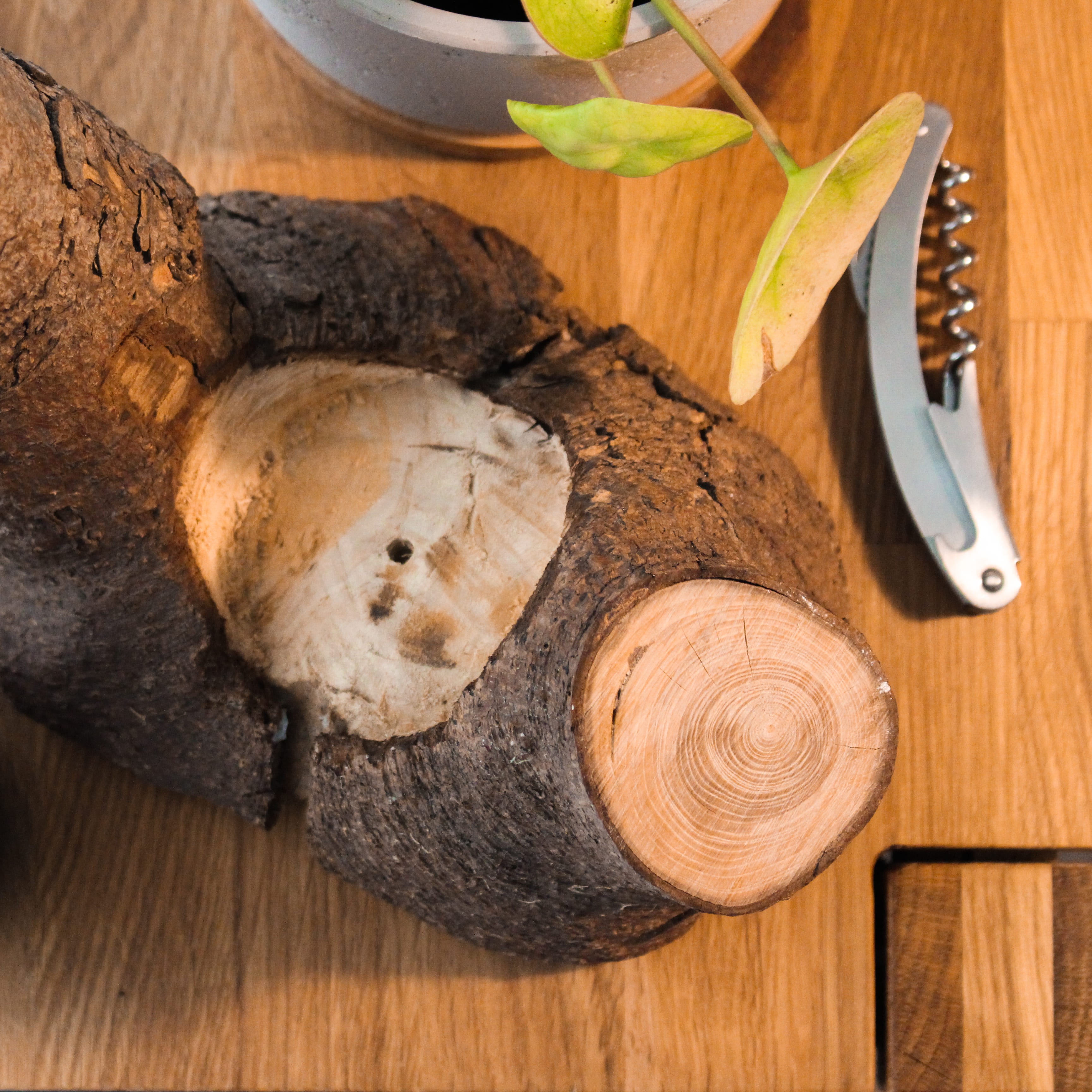 Made from a found branch fork, this Wine Holder is shaped just enough to let the natural form do the work—cradling a bottle with an effortless, balanced elegance. Tool marks and organic irregularities stay visible, keeping the piece honest and tactile. A small embedded magnet adds a quiet functional touch, holding a bottle opener or other small metal essentials right where you need them.